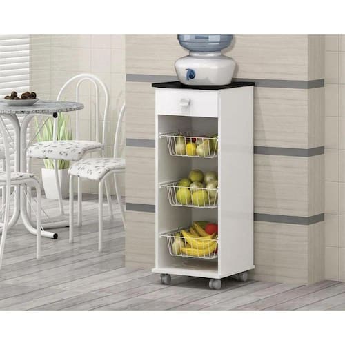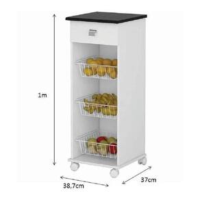 Armário Auxiliar Fruteira Talita 1 Gaveta e 3 Cestos BrancaA Fruteira Talita possui 1 gaveta com corrediças metálicas, 3 cestos metálicos feitos com pintura eletrostática que não encardem e não enferrujam, fáceis de limpar.Ideal para armazenamento de frutas e legumes, possui rodízios para uma melhor movimentação e facilidade de limpeza.Pode ser utilizado para áreas de cozinha e lavanderia. Esse móvel é ideal para pessoas que gostam de organização.Produzido em MDP conta com um design sofisticado irá harmonizar com seu ambiente de casa. Além disso, o produto possui uma fácil montagem.Marca: Quarta DivisãoModelo: TalitaAltura 100 cmLargura 38 cmProfundidade 37 cm