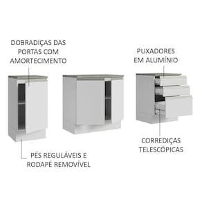 Os balcões também contam com puxadores em alumínio e pés reguláveis em PVC, com rodapé removível em MDP, facilitando a limpeza.