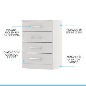 Você merece o melhor quando se trata de móveis para sua casa e a escolha certa para atender todas as suas necessidades. Com um design atual, une versatilidade, conforto e beleza. Com quatro gavetas, você terá muito espaço para manter tudo organizado e ao alcance das mãos. Produzida com materiais de excelente qualidade, garantindo a sua resistência ao desgaste diário e mantendo sua beleza e funcionalidade por muito tempo. O melhor em móveis no design atual aliando conforto, qualidade e ótimos preços, só na Menu Móveis! CARACTERÍSTICAS TÉCNICAS: - Produzido em MDP de 12 mm - Acabamento UV na cor Branco - Gavetas com Corrediça Plástica - Puxadores Alça em ABS na cor Cromado INFORMAÇÕES TÉCNICAS: Altura: 93 cm Largura: 55,5 cm Profundidade: 38,5 cm Peso: 20 kg INFORMAÇÕES ADICIONAIS: *ATENÇÃO: Não trabalhamos e não nos responsabilizamos pela montagem do móvel. Antes da montagem conferir se o produto está de acordo com o que comprou, produto montado e danificado pela montagem não será aceito troca. **As imagens ambientadas são meramente ilustrativas e podem apresentar itens que não compõe o produto. As cores do produto podem variar de acordo com o monitor, a iluminação do ambiente ou sua percepção visual. ***Limpeza: Deve ser feita com pano macio e seco ou levemente umedecido com água e sabão neutro. Não devem ser utilizados abrasivos como palha de aço e objetos cortantes. Garantia para defeitos de fabricação conforme Código de Defesa do Consumidor. Ean: 6015057226239 Ean: 6015057226239