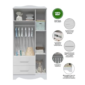 Possui 3 portas lisas, cabideiro metálico para pendurar roupas de forma organizada e 2 gavetas amplas com corrediças telescópicas metálicas para abertura suave e silenciosa. Os puxadores, fabricados em MDF revestido com papel melamínico, proporcionam durabilidade e beleza. O produto acompanha dois modelos de rodapés (reto ou usinado/torneado), permitindo personalizar o visual durante a montagem.
