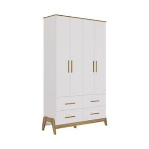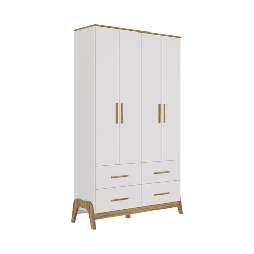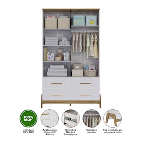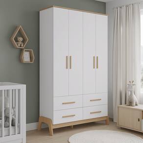 O Armário Infantil Guti Retrô 4 Portas Lisas une design sofisticado e funcionalidade para o quarto infantil. Fabricado 100% em MDF, possui pintura atóxica de alta qualidade, garantindo segurança e durabilidade. Sua estrutura conta com caixote em chapa de 12 mm e tampo superior em chapa de 15 mm. Os pés, usinados em peça única de MDF 25 mm, conferem charme retrô e estabilidade. Os puxadores em MDF revestido com papel melamínico adicionam um toque de estilo. Com cabideiro metálico e gavetas equipadas com corrediças telescópicas, oferece organização prática e eficiente para roupas e acessórios.