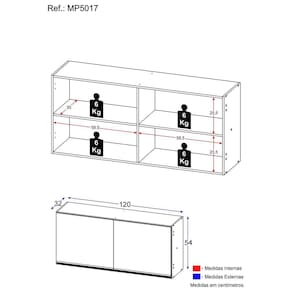 Dimensões do produto montado: Altura: 54cm | Largura: 120cm | Profundidade: 32cm *Você pode consultar as medidas internas na imagem técnica do produto.
