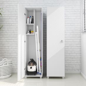 O Armário Lavanderia Multiuso com 1 Porta Multimóveis possui 2 nichos internos com espaço para guardar vassoura, aspirador de pó e/ou baldes. Sua estrutura é em MDP, acabamento em pintura UV, com acompanhamento de gancho, e suporta 5Kg cada prateleira e 20Kg base. Este móvel garante melhor organização dos objetos de forma simples e prática.