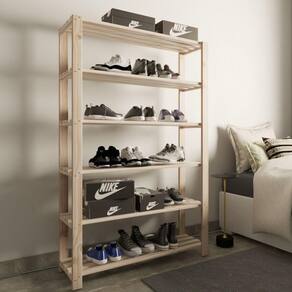 Estante arara com prateleiras e estrutura em madeira maciça de Pinus.