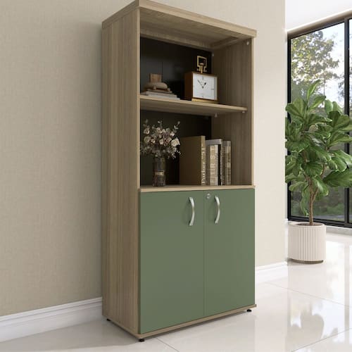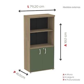 Possui 2 portas pivotantes com fechadura e chave, oferecendo proteção para documentos, materiais e objetos pessoais. Seu interior é versátil, com parte equipada com prateleiras para melhor organização e espaço livre para itens maiores.