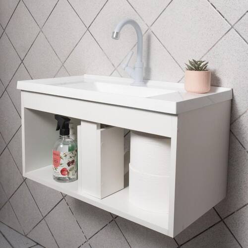 Altura: 33cm Largura: 40cm Profundidade: 30cm Não possui prateleiras Acompanha Cuba de Mármore Sintético/Resina/Brilho