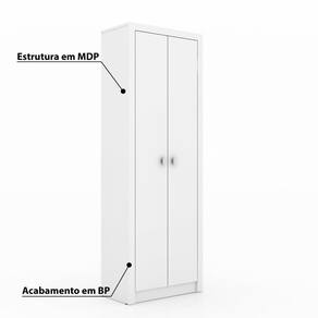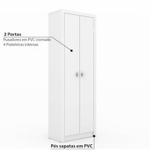 Características - Cor: Branco. - Estrutura em MDP. - Acabamento em BP. - 2 Portas. - 4 Prateleiras internas. - Puxadores PVC cromado. - Pés 4 sapatas em PVC. - Fundo de fibra 3 mm. - Suporta: Até 12 Kg. - Móvel entregue desmontado.