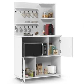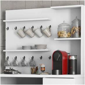 O Cantinho do Café e mais do que um simples complemento, é um móvel inovador capaz de transformar o ambiente, confira! Estrutura em MDP/MDF com acabamento em pintura BP garantem durabilidade e resistência ao produto, ele possui espaço para forno ou micro ondas e também conta com 2 portas convencionais com amplo espaço interno para armazenar itens diversos. Ah, mas o diferencial são as prateleiras e ganchos superiores para pendurar suas xícaras ou panos de prato. Demais, né?