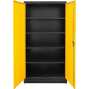 Armário multiuso com 4 prateleiras internas, que permitem o acondicionamento e organização de ferramentas e dos mais variados objetos. Produzido todo em aço carbono, com base em aço galvanizado, possui fechadura do tipo cremona a chave (acompanha duas chaves) e fechamento triplo. Conta ainda com pintura eletrostática a pó, batentes de borracha nas portas (redutor de ruídos), ventilação nas duas portas e 4 sapatas reguladoras para ajuste de desníveis.