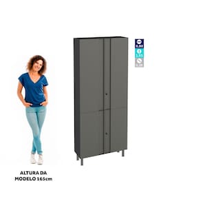 Informações técnicas: Peso do móvel: 30,04 kg Peso suportado: 90 kg Puxador: Polipropileno Número de portas: 4 Tampo: Não Quantidade de prateleiras: 4 Cor Interna: Cinza Cor Externa: Cinza com Preto Semi Brilho Garantia: 12 (doze) meses para defeitos de fabricação