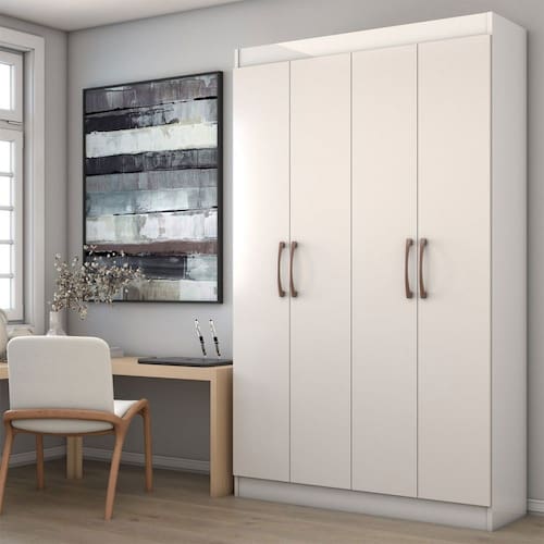 O(a) Armário Multiuso Albuquerque 4 Portas 8 Prateleiras Branco - Loja é produzido em MDP na escala de brilho Brilhante, e possui um grau de dificuldade de montagem: Médio.