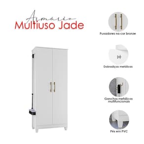 Está procurando móveis para sua casa? Apresentamos para você este belo armário multiuso da linha Jade. Com duas portas e quatro prateleiras internas, proporciona um excelente aproveitamento para acomodar diversos itens. Seu diferencial é o gancho metálico multifuncional, ideal para pendurar seus acessórios, otimizando ainda mais o espaço. Os puxadores na cor bronze dão um charme. Fabricado pela Moval é desenvolvido em MDP. Sendo a escolha ideal para quem busca praticidade, versatilidade, organização e um toque de sofisticação, aproveite!