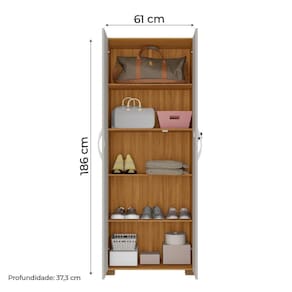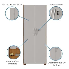O multiuso Chicago com chave nas portas, é ideal para diversos cômodos da sua casa. Ele possui 5 prateleiras bem distribuídas e espaçosas para organizar seus pertences com chaves, garantindo que você organize, e mantenha a segurança. Também conta com uma maior profundidade que a maioria dos multiusos. Essencial para seu ambiente de trabalho! MODELO: Armário Multiuso Chicago / MARCA: Notavel / MEDIDAS: [ A ] = 186 cm - [ L ] = 61 cm - [ P ] = 37,30 cm / COR: Freijó / Off White / MATERIAL: MDP, produzido a partir de madeira reflorestada / PINTURA: UV (Ultravioleta) / ACABAMENTO: Brilho / Fosco / PORTA: 2 Portas / TIPO DE PORTA: Articulada / PRATELEIRA: 4 / PESO SUPORTADO POR PRATELEIRA: 5 Kg / PÉS: 4 / MATERIAL DOS PÉS: Plástico / DIFERENCIAL: Fechadura para armazenar tudo com segurança / PESO DO PRODUTO: 32,90 kg / INSTRUÇÕES E CUIDADOS: Não deve ser exposto a água e nem a ambientes umidos. Fazer a limpeza com um pano seco e livre de produtos abrasivos / GARANTIA: 3 meses / Montagem não inclusa. Entregamos até a porta de entrada da casa do cliente ou até a portaria do condomínio. MODELO: Armário Multiuso Chicago | MARCA: Notavel | MEDIDAS: [ A ] = 186 cm [ L ] = 61 cm [ P ] = 37,30 cm | COR: Freijó / Off White | MATERIAL: MDP, produzido a partir de madeira reflorestada | PINTURA: UV (Ultravioleta) | ACABAMENTO: Brilho / Fosco | PORTA: 2 | TIPO DE PORTA: Articulada | PRATELEIRA: 4 | PESO SUPORTADO POR PRATELEIRA: 5kg | PÉS: 4 | MATERIAL DOS PÉS: Plástico | DIFERENCIAL: Fechadura para armazenar tudo com segurança | PESO DO PRODUTO: 32,90kg | INSTRUÇÕES E CUIDADOS: Não deve ser exposto a água e nem a ambientes umidos. Fazer a limpeza com um pano seco e livre de produtos abrasivos | GARANTIA: 3 meses | OBS: Montagem não inclusa. Entregamos até a porta de entrada da casa do cliente ou até a portaria do condomínio. Cor: Freijo Off White