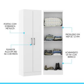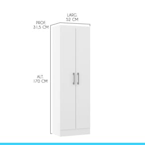O Armário Multiuso foi desenvolvido pensando em atender todas as suas necessidades do dia a dia com um design atual, unindo versatilidade, conforto e beleza. Pode ser utilizado como sapateiro no quarto, armário multiuso na área de serviço, armário extra na cozinha, guarda objetos da garagem ou onde você precisar. Possui duas porta e prateleiras internas perfeitas para manter tudo organizado. Produzido com materiais de excelente qualidade, garantindo a sua durabilidade. O melhor em móveis no design atual aliando conforto, qualidade e ótimos preços, só na Menu Móveis! CARACTERÍSTICAS TÉCNICAS: - Produzido em MDP de 12 mm - Acabamento UV na cor Branco - Portas com Dobradiça Metálica - Puxadores Alça em ABS na cor Prata INFORMAÇÕES TÉCNICAS: Altura: 170 cm Largura: 52 cm Profundidade: 31,5 cm Peso: 22 kg INFORMAÇÕES ADICIONAIS: - ATENÇÃO: Não trabalhamos e não nos responsabilizamos pela montagem do móvel. Antes da montagem conferir se o produto está de acordo com o que comprou, produto montado e danificado pela montagem não será aceito troca. - As imagens ambientadas são meramente ilustrativas e podem apresentar itens que não compõe o produto. As cores do produto podem variar de acordo com o monitor, a iluminação do ambiente ou sua percepção visual. - Limpeza: Deve ser feita com pano macio e seco ou levemente umedecido com água e sabão neutro. Não devem ser utilizados abrasivos como palha de aço e objetos cortantes. Garantia para defeitos de fabricação conforme Código de Defesa do Consumidor. Ean: 7805295041225 Ean: 7805295041225