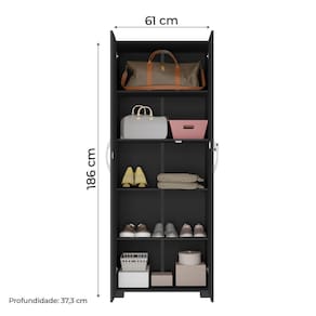 O multiuso Chicago com chave nas portas, é ideal para diversos cômodos da sua casa. Ele possui 5 prateleiras bem distribuídas e espaçosas para organizar seus pertences com chaves, garantindo que você organize, e mantenha a segurança. Também conta com uma maior profundidade que a maioria dos multiusos. Essencial para seu ambiente de trabalho! / MODELO: Armário Multiuso Chicago / MARCA: Notavel / MEDIDAS: [ A ] = 186 cm - [ L ] = 61 cm - [ P ] = 37,30 cm / COR: Preto / MATERIAL: MDP, produzido a partir de madeira reflorestada / PINTURA: UV (Ultravioleta) / ACABAMENTO: Fosco / PORTA: 2 Portas / TIPO DE PORTA: Articulada / PRATELEIRA: 4 / PESO SUPORTADO POR PRATELEIRA: 5 Kg / PÉS: 4 / MATERIAL DOS PÉS: Plástico / DIFERENCIAL: Fechadura para armazenar tudo com segurança / PESO DO PRODUTO: 32,90 kg / INSTRUÇÕES E CUIDADOS: Não deve ser exposto a água e nem a ambientes umidos. Fazer a limpeza com um pano seco e livre de produtos abrasivos / GARANTIA: 3 meses / Montagem não inclusa. Entregamos até a porta de entrada da casa do cliente ou até a portaria do condomínio.