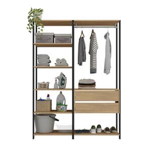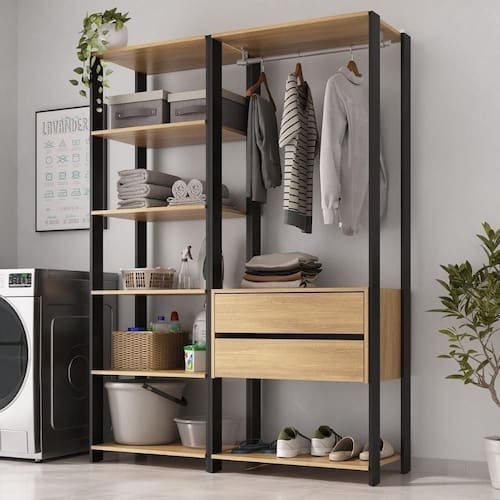 O armário é equipado com 7 prateleiras espaçosas (suportam até 8kg em cada), ideais para manter produtos de limpeza e utensílios de lavanderia organizados de forma inteligente, ajudando você a criar um ambiente mais eficiente e funcional para as tarefas domésticas. O cabideiro de madeira revestido garante que suas roupas, sejam longas ou curtas, fiquem sempre impecáveis. Além disso, com 2 gavetas que possuem corrediças metálicas, o manuseio ganha leveza e praticidade. O design aberto e moderno que realça qualquer espaço.