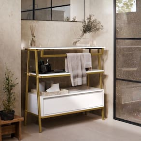 Características do Produto: -Design moderno e funcional -Gaveta ampla para itens de higiene, maquiagem e acessórios -Suporte para toalha mais praticidade no cotidiano -Pés em metalon resistentes, proporcionando durabilidade e estilo -Ideal para banheiros, lavabos ou espaços compactos