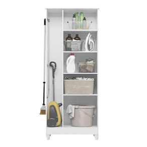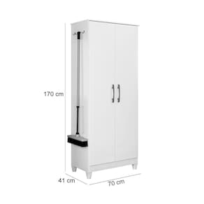 Características Estrutura em MDP de 12mm. Pintura em acabamento UV. 02 Portas articuladas com dobradiças metálicas. 04 Ganchos de metal para vassouras. Puxadores na cor bronze. Pés em PVC. Amplo espaço com prateleiras. Cantoneira de metal para fixação na parede.