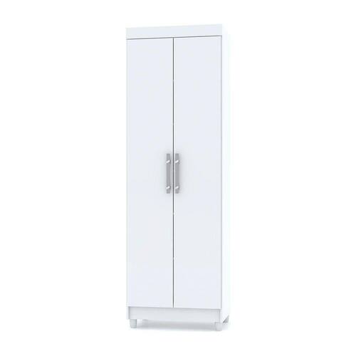 Este armário conta com duas portas que abrem para revelar um espaço interno bem distribuído, com prateleiras ajustáveis que permitem acomodar itens de diferentes tamanhos.
