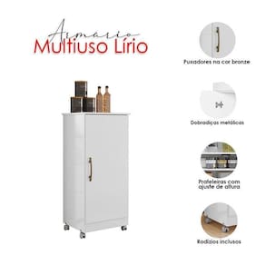 Começou a procurar móveis para sua casa? Então apresentamos para você este belo armário multiuso da linha Lírio. Possuindo uma porta com puxador na cor bronze, um toque de elegância. Com três prateleiras internas com ajustes de altura, proporcionando mais flexibilidade de acordo com sua necessidade, oferecendo um ótimo espaço interno para acomodar vários itens. O diferencial fica por conta dos rodízios, facilitando sua movimentação. Fabricado pela Moval, é desenvolvido em MDP de alta qualidade. Sendo a escolha ideal para quem está buscando praticidade, organização e versatilidade no dia a dia, aproveite!