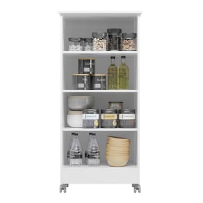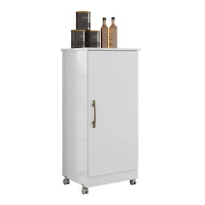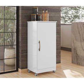 Características Estrutura em MDP de 12mm. Pintura em acabamento UV. 01 Porta articulada com dobradiças metálicas. Puxador na cor bronze. 04 Rodízios. Amplo espaço composto por prateleiras com opções de regulagem na altura.