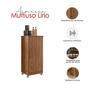 Começou a procurar móveis para sua casa? Então apresentamos para você este belo armário multiuso da linha Lírio. Possuindo uma porta com puxador na cor bronze, um toque de elegância. Com três prateleiras internas com ajustes de altura, proporcionando mais flexibilidade de acordo com sua necessidade, oferecendo um ótimo espaço interno para acomodar vários itens. O diferencial fica por conta dos rodízios, facilitando sua movimentação. Fabricado pela Moval, é desenvolvido em MDP de alta qualidade. Sendo a escolha ideal para quem está buscando praticidade, organização e versatilidade no dia a dia, aproveite!