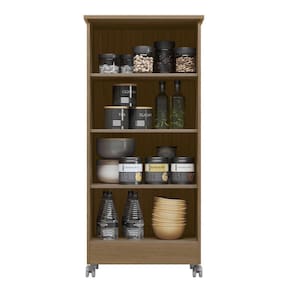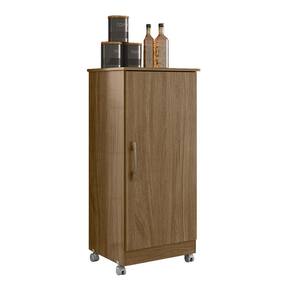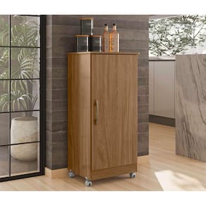Características Estrutura em MDP de 12mm. Pintura em acabamento UV. 01 Porta articulada com dobradiças metálicas. Puxador na cor bronze. 04 Rodízios. Amplo espaço composto por prateleiras com opções de regulagem na altura.