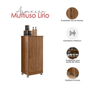 Começou a procurar móveis para sua casa? Então apresentamos para você este belo armário multiuso da linha Lírio. Possuindo uma porta com puxador na cor bronze, entrega um toque de elegância. Com três prateleiras internas com ajustes de altura, proporcionando mais flexibilidade de acordo com sua necessidade, oferecendo um ótimo espaço interno para acomodar vários itens. O diferencial fica por conta dos rodízios, facilitando sua movimentação. Fabricado pela Moval, é desenvolvido em MDP de alta qualidade. Sendo a escolha ideal para quem está buscando praticidade, organização e versatilidade no dia a dia, aproveite!
