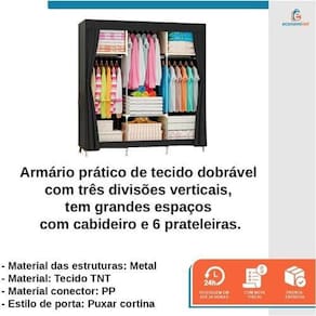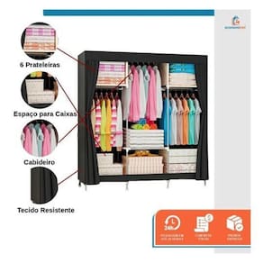 - Possui três divisões verticais; - Grandes espaços para pendurar roupas com suporte de cabides; - 6 prateleiras espaçosas; - Seu acabamento possui cortina com sistema de abrir e fechar de zíper; - Sua estrutura é resistente composta de metal e tecido respirável de excelente qualidade; - Tecido de fácil remoção pode ser lavado sempre que necessário.