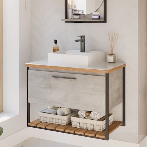 O Armário para banheiro suspenso Caribe deixará seu banheiro ainda mais charmoso com uma porta basculante com abertura com pistão à gás prateleira formato ripado 100 MDF puxadores em ABS estrutura 100 MDF e metalon amplo espaço interno lavatório em mármore sintético com mais durabilidade e resistência.