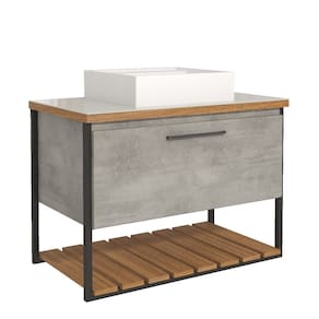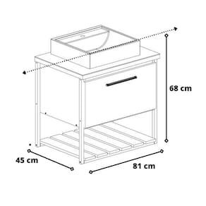1 Porta basculante com abertura com pistão à gás Prateleira formato ripado Puxadores em ABS Estrutura MDF e metalon Lvatório em mármore sintético