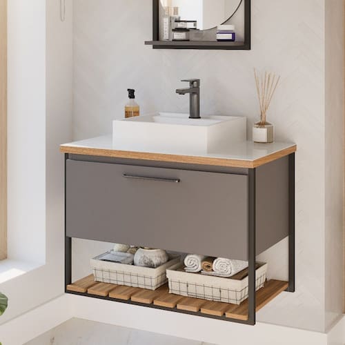 O Armário para banheiro suspenso Caribe deixará seu banheiro ainda mais charmoso com uma porta basculante com abertura com pistão à gás prateleira formato ripado 100 MDF puxadores em ABS estrutura 100 MDF e metalon amplo espaço interno lavatório em mármore sintético com mais durabilidade e resistência.