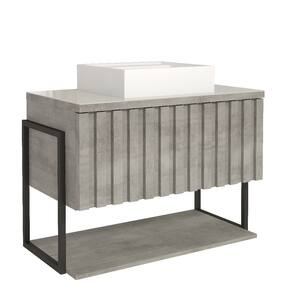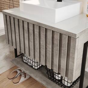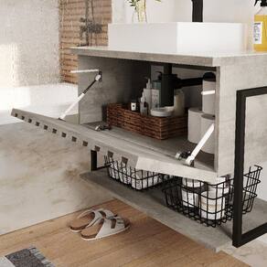 1 Porta basculante com abertura com pistão à gás Prateleira formato ripado Puxadores em ABS Estrutura MDF e metalon Lvatório em mármore sintético