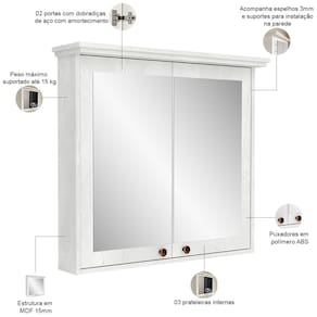 Fabricado em MDF de alta qualidade, portas com amortecimento e puxadores redondos com design requintado e fácil manuseio, esse armário para banheiro fará toda a diferença no seu ambiente, já que além de imponente, possui excelente espaço interno, com repartições que auxiliam na organização e facilita a rotina. Para completar, o armário aéreo possui espelho lapidado nas duas portas, tornando-o ainda mais funcional.