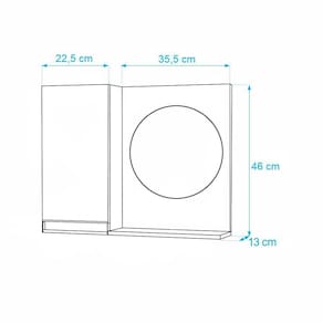 Suas medidas totais são: 58cm de Largura x 46cm de Altura x 13cm de Profundidade. O espelho mede: 33cm diâmetro. Peso: 7,5kg.