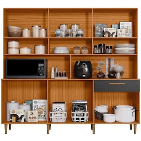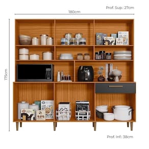 Projetado para unir praticidade e versatilidade, ele pode ser utilizado tanto como peça única quanto como complemento da sua cozinha. Amplo espaço interno com 12 portas e prateleira para guardar mantimentos, utensílios e louças; gaveta com corrediças metálicas, nicho prático para eletroportáteis, produzido em MDP com acabamento em pintura UV, puxadores em polímero e pés fixos em PVC de 14cm que garantem firmeza e estabilidade.
