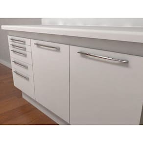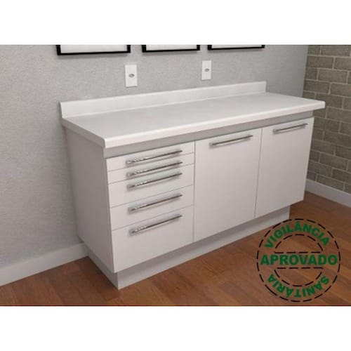 - Balcão clínico composto por 2 (dois) módulos porta com duas prateleiras reguláveis e módulo gaveteiro com 05 (cinco) gavetas.