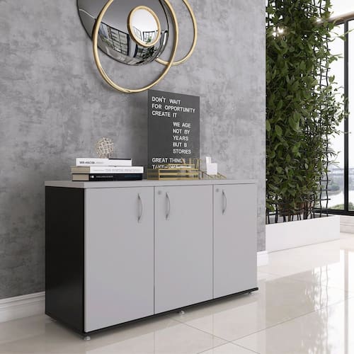 Seu design clean combina facilmente com diferentes mobílias, mantendo a harmonia da decoração. Ideal para o dia a dia de trabalho, é perfeito para deixar seu ambiente organizado, funcional e elegante. Acabamento da Porta: BP Acabamento da Prateleira: BP Ambiente Principal: Escritório Armário Suspenso: Não codigo_ean: 7900288197443 Complexidade da Montagem: Média: pode ser montado por mais de uma pessoa e/ou necessite de maior conhecimento para montagem Cor: Preto/Cinza Cor do Produto: Preto/Cinza Cor Interna: Preto Escala de Brilho: Semi-Fosco Escala de Brilho da Porta: Semi-Fosco Escala de Brilho da Prateleira: Semi-Fosco Formato do Armário: Retangular Itens Inclusos: 1 Armário, Kit Ferragens e Manual de Montagem Linha ou Coleção: Credenza Manual de Montagem e Instalação: https://product-hub-prd.madeiramadeira.com.br/928350630/documents/bdbab74b-b8c9-4ddb-8498-91d7c4a0c8442723979387017411828145805.pdf Marca: Pandin Móveis Material da Porta: MDP Material da Prateleira: MDP Material dos Pés: Polipropileno Material Principal: MDP Necessita Montagem: Sim Orientação do Armário: Horizontal Origem do Produto: Nacional Peso: 38,882 kg Peso Máximo por Prateleira: 15 kg Possui Espelho: Não Possui Mesa Retrátil: Não Possui Pés: 06 Possui Portas: 03 Possui Prateleiras: 03 Quantidade de Armários: 1 Recomendações de Uso, Manutenção e Limpeza: Limpeza feita com um pano levemente umedecido e um pano seco. Sapatas Niveladoras: Sim Sistema de Montagem: Parafuso Suporta Até (kg): 30 kg Tamanho do Armário: Baixo (Até 90cm) Tipo de Armário: Totalmente Fechado Tipo de Dobradiça/Corrediça da Porta: Alumínio Tipo de Puxador da Porta: Externo Marca: Não Informado