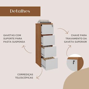 Características do Armário para Escritório com 4 Gavetas e Chave Arquivo: - Tampo em Tamburato 37mm com fita de borda ABS 1mm de espessura; - Estrutura em MDP 15mm com fita de borda ABS 0,45mm de espessura; - Quatro gavetas com suporte para pasta suspensa e trilho telescópico; - Chave para travamento da gaveta superior; - Fundo das gavetas em MDF 6mm de espessura; - Traseira revestida; - Sapatas plásticas com regulagem de altura; - Capacidade de carga de 10kg bem distribuídos; - Não acompanha objetos decorativos; - Montagem por conta do comprador;