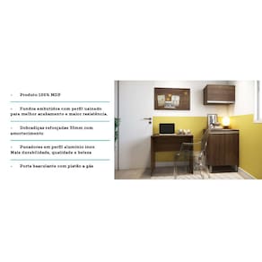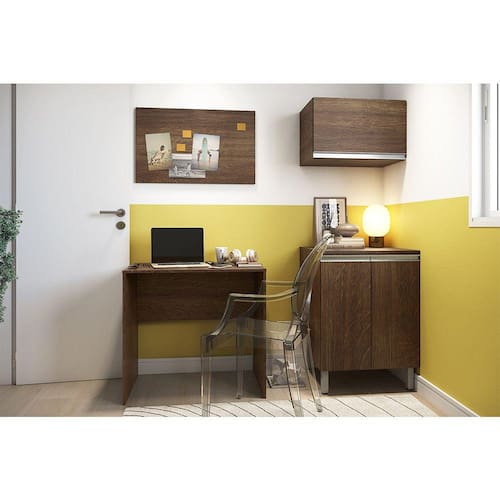 O Armário para Escritório com Escrivaninha, acompanha um painel, balcão e um aéreo para ajudar na organização do seu dia, você pode usar esse produto de maneira bem versátil. Com acabamento em BP, maior resistência contra riscos.