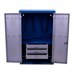 - Características Contém duas prateleiras Contém acessórios para ferramentas e 3 gavetas Pintura Eletrostática Possui porta com sistema anti-furto Ármario chaveado Acompanha chave reserva Possui furação com reforço para fixação na parede Não acompanha bucha e parafuso para fixação Divisórias nas Gavetas 01 e 02