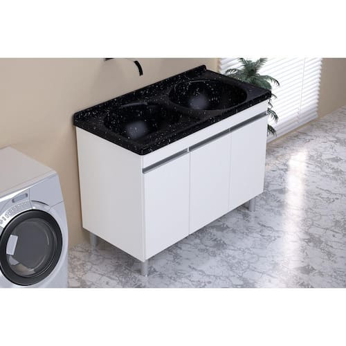 A linha Lavanderia Amélia texturizado é moderna e prática. O armário acondiciona tanque duplo de 110cm se encaixando de ambientes menores até os mais amplos, além de possibilitar o armazenamento de produtos junto ao tanque. Sua estrutura é em Bp revestido com lâmina melamínico texturizado, com bordas encabeçadas em fita Pvc, travessas em madeira, assoalhos estilo sanduíche com estrutura feita com madeira de reflorestamento tratada em estufas com alta temperatura, revestido em duratree em ambos os lados, pés de rosca e puxadores em perfil de alumínio.
