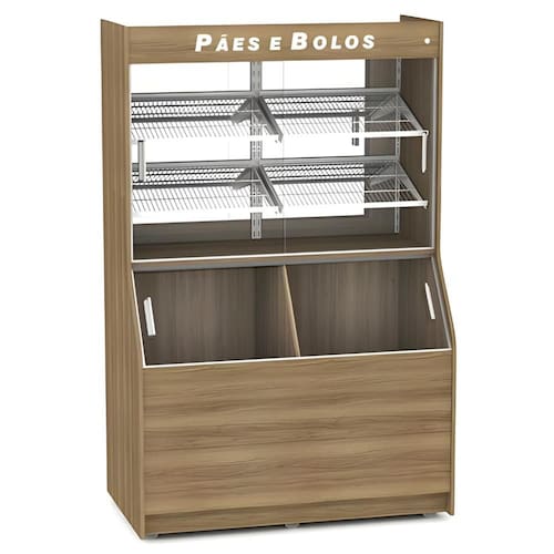 Este expositor para pães combina durabilidade, funcionalidade e um design moderno para valorizar seus produtos e facilitar o atendimento. Com gabinetes estruturados em MDF laminado de 15mm, oferece resistência e um acabamento sofisticado. Suas prateleiras inclinadas tipo aramado garantem melhor exposição dos pães, enquanto os suportes tipo mão francesa em aço galvanizado permitem regulagem de altura para maior praticidade. Conta ainda com pés ajustáveis, espelho traseiro de 3mm para ampliar a visibilidade dos produtos e portas de correr em vidro temperado, proporcionando um manuseio seguro e eficiente no dia a dia.