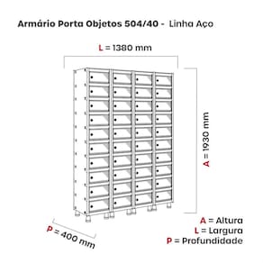 Nosso armário Porta Objeto de aço tem 40 portas com fechadura Pitão este armário proporciona alta segurança e maior durabilidade, por sua vez a capacidade de 5kg, facilitando a organização do seu ambiente de trabalho no dia dia. Acabamento da Porta: Pintura Acabamento da Prateleira: Pintura Acabamento dos Pés: Polipropileno Altura dos Pés: 6 Ambiente Principal: Comércio Complexidade da Montagem: Média: pode ser montado por mais de uma pessoa e/ou necessite de maior conhecimento para montagem Cor: Cinza/Azul Del Rey Cor do Produto: Cinza/Azul Del Rey Cor Flex: Não Cor Interna: Cinza/Azul Del Rey Escala de Brilho: Semi-Fosco Escala de Brilho da Porta: Semi-Fosco Escala de Brilho da Prateleira: Semi-Fosco Itens Inclusos: 1 Armário para Escritório, Kit Ferragens e Manual de Montagem. Linha ou Coleção: Aço Manual de Especificação Técnica: https://cdn2.madeiramadeira.com.br/prd/pandin/689139-view-usp-sharing.view%3Fusp%3Dsharing Manual de Montagem e Instalação: https://cdn2.madeiramadeira.com.br/prd/pandin/689138-view-usp-sharing.view%3Fusp%3Dsharing Material da Porta: Aço Material da Prateleira: Aço Material dos Pés: Polipropileno Material Principal: Aço Montagem Flex: Não Necessita Montagem: Sim Origem do Produto: Nacional Pés Reguláveis: Sim Peso: 72.91 Peso Máximo por Prateleira: kg Possui Espelho: Não Possui Pés: 16 Possui Portas: 10 Possui Prateleiras: Não Recomendações de Uso, Manutenção e Limpeza: Utilizar um pano levemente umedecido com água, para finalizar utilizar um pano seco. Sapatas Niveladoras: Não Sistema de Montagem: Encaixe Suporta Até (kg): 200 Tipo de Dobradiça/Corrediça da Porta: Aço Tipo de Puxador da Porta: Embutido