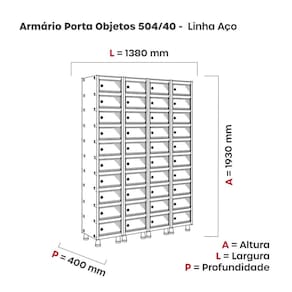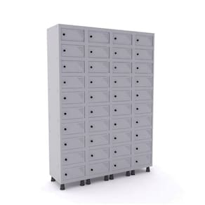 Nosso armário Porta Objeto de aço tem 40 portas com fechadura Pitão este armário proporciona alta segurança e maior durabilidade, por sua vez a capacidade de 5kg, facilitando a organização do seu ambiente de trabalho no dia dia. Acabamento da Porta: Pintura Acabamento da Prateleira: Pintura Acabamento dos Pés: Polipropileno Altura dos Pés: 6 Ambiente Principal: Comércio Complexidade da Montagem: Média: pode ser montado por mais de uma pessoa e/ou necessite de maior conhecimento para montagem Cor: Cinza Cor do Produto: Cinza Cor Flex: Não Cor Interna: Cinza Escala de Brilho: Semi-Fosco Escala de Brilho da Porta: Semi-Fosco Escala de Brilho da Prateleira: Semi-Fosco Itens Inclusos: 1 Armário para Escritório, Kit Ferragens e Manual de Montagem. Linha ou Coleção: Aço Manual de Especificação Técnica: https://cdn2.madeiramadeira.com.br/prd/pandin/689137-view-usp-sharing.view%3Fusp%3Dsharing Manual de Montagem e Instalação: https://cdn2.madeiramadeira.com.br/prd/pandin/689136-view-usp-sharing.view%3Fusp%3Dsharing Material da Porta: Aço Material da Prateleira: Aço Material dos Pés: Polipropileno Material Principal: Aço Montagem Flex: Não Necessita Montagem: Sim Origem do Produto: Nacional Pés Reguláveis: Sim Peso: 72.91 Peso Máximo por Prateleira: kg Possui Espelho: Não Possui Pés: 16 Possui Portas: 10 Possui Prateleiras: Não Recomendações de Uso, Manutenção e Limpeza: Utilizar um pano levemente umedecido com água, para finalizar utilizar um pano seco. Sapatas Niveladoras: Não Sistema de Montagem: Encaixe Suporta Até (kg): 200 Tipo de Dobradiça/Corrediça da Porta: Aço Tipo de Puxador da Porta: Embutido