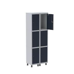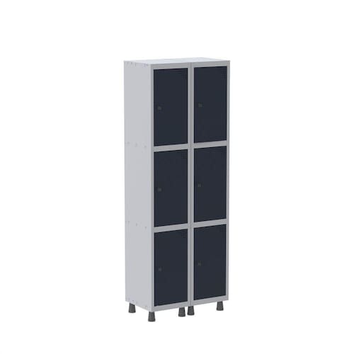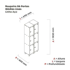 Armário Roupeiro de Aço totalmente montável, dispensa a utilização de parafusos, estrutura em chapas #24 e #26 (0,60mm e 0,45mm) conta com uma porta com estampos circulares em formação triangular para ventilação, sistema de fechamento de varão de 3 pontos, através de pitão para cadeado. Acabamento da Porta: Pintura Ambiente Principal: Banheiro Complexidade da Montagem: Média: pode ser montado por mais de uma pessoa e/ou necessite de maior conhecimento para montagem Cor: Cinza/Azul Del Rey Cor do Produto: Cinza/Azul Del Rey Cor Interna: Cinza Escala de Brilho: Semi-Fosco Escala de Brilho da Porta: Semi-Fosco Itens Inclusos: 1 Armário, Kit Ferragens e Manual de Montagem Manual de Montagem e Instalação: https://cdn2.madeiramadeira.com.br/prd/pandin/689562-view-usp-sharing.view%3Fusp%3Dsharing Material da Porta: Aço Material dos Pés: Polipropileno Material Principal: Aço Necessita Montagem: Sim Origem do Produto: Nacional Pés Reguláveis: Sim Peso: 28.99 Possui Espelho: Não Possui Pés: 08 Possui Portas: 06 Possui Prateleiras: Não Recomendações de Uso, Manutenção e Limpeza: Utilizar um pano levemente umedecido com água, para finalizar utilizar um pano seco. Sapatas Niveladoras: Não Sistema de Montagem: Encaixe Suporta Até (kg): 15 Tipo de Dobradiça/Corrediça da Porta: Aço Tipo de Puxador da Porta: Embutido