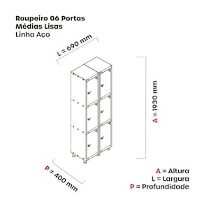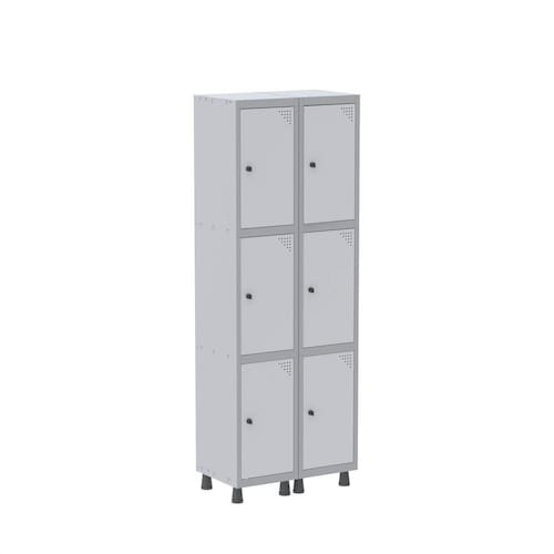 Armário Roupeiro de Aço totalmente montável, dispensa a utilização de parafusos, estrutura em chapas #24 e #26 (0,60mm e 0,45mm) conta com uma porta com estampos circulares em formação triangular para ventilação, sistema de fechamento de varão de 3 pontos, através de pitão para cadeado.