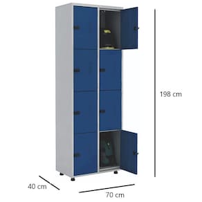 O Armário Roupeiro de Aço 8 Portas Vestiário Academia Guarda-Volumes com trinco para cadeados é perfeito para alojamentos, escritórios, almoxarifados, laboratórios, hospitais, farmácias, depósitos, academias, supermercados, vestiários, e diversos outros ambientes.