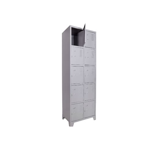 Armário Roupeiro de aço para vestiário, produzido em aço chapa 26 0,45mm, possui 10 portas com venezianas para ventilação, compartimento de tamanho médio independentes sem divisórias internas, fechamento das portas através de pitão para cadeado.