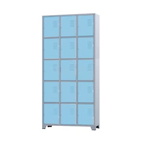 CONEXÃO MOVEISArmário Roupeiro de aço para vestiário,ideal para academias, surpermercados, empresa e para uso geral. Produzido em aço chapa 26 0,45mm de alta qualidade com tratamento anti-ferruginoso, o acabamento em sistema de pintura eletrostática a alta temperatura epóxi, tambem garante maior durabilidade da cor e resistencia a ferrugem. Possui 15 portas com venezianas para ventilação, compartimentos de tamanhos médios independentes sem divisórias internas, que garante que você consiga armazenar itens como bolsas, mochilas e entre outros. O fechamento das portas é através de CHAVE. Características- Quantidade de Portas: 15- Cor: Cinza Padrão / Portas Azul Claro- Chapa: 26 / 0,45mm- Medida das Portas/ Vãos: 035Alt x 026Larg- Sistema de Ventilação: Veneziana- Fechamento: CHAVE- Quantidade de cabides por porta: 0- Pés removíveis: Não- Desmontável: Não ( Exceto portas que podem ser trocadas ).- Pintura: Epóxi PóALTURA: 197cmLARGURA: 92cmPROFUNDIDADE: 36cmPESO: 35kgGARANTIA: 3 MesesEspecificação de chapa e acabamento: Roupeiro produzido em chapa de aço tratada com antiferruginoso por fosfatização e pintura epóxi-pó por processo eletrostático.